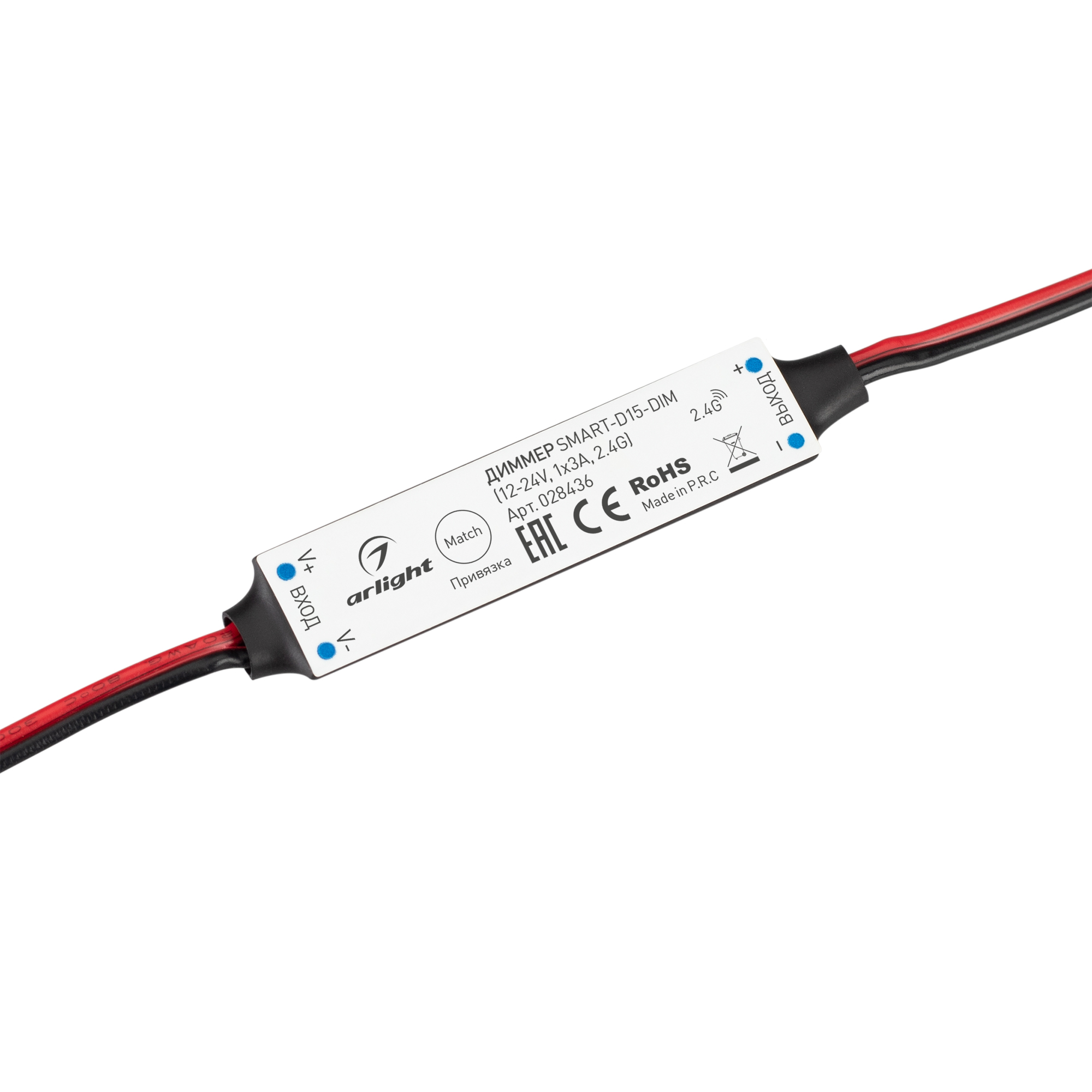 Миниатюрный диммер для монохромной светодиодной ленты (ШИМ). Питание/рабочее напряжение 12-24VDC, максимальный ток 3A на канал, 1 канал, максимальная мощность 36-72W. Габариты 60x14x6 мм (габариты проводов 91x4x2 мм). Совместим с пультами и панелями SMART, поддерживающими диммирование по радиоканалу. !!!Актуальная схема привязки пультов в инструкции на сайте!!!