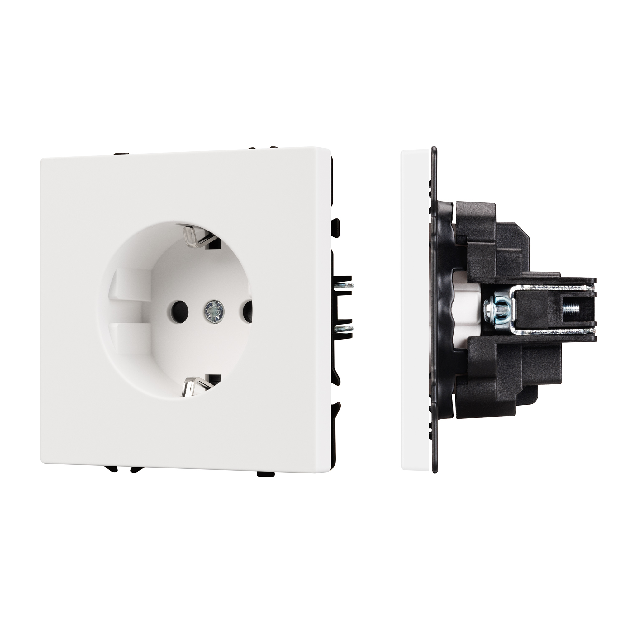 Строгие геометрические линии гармонично сочетаются с функциональностью продуманных механизмов, создавая идеальное решение для дизайн-проектов, где важны как эстетика, так и практичность. Механизм розетки с заземлением совместим с рамками серии NOBE, создает утонченный минималистичный вид. Скрытый тип монтажа позволяет гармонично встроить в интерьер любого современного дизайн-проекта. Видимая часть механизма выполнена из высококачественного пластика белого цвета и имеет Soft-Touch покрытие, что придает изделию приятные тактильные ощущения и стильный внешний вид. Розетка оснащена заземляющими контактами и защитными шторками, обеспечивая надежное и безопасное подключение электроприборов. Соединение посредством быстрозажимных контактов, позволяет надежно подсоединить механизм розетки к питающим элементам, минимизируя затраченное время на монтаж. А усиленные распорные лапки двойного захвата надежно фиксируют механизм в установочном подрозетнике круглого сечения диаметром 60мм. Суппорт окрашен в черный матовый цвет под основу механизма и выполнен из металла толщиной 1,5мм, что обеспечивает безопасность и уверенность в установке. На каждой стороне суппорта размещены фиксирующие элементы, позволяющие комбинировать механизмы в системы до 5шт как горизонтально, так и вертикально.