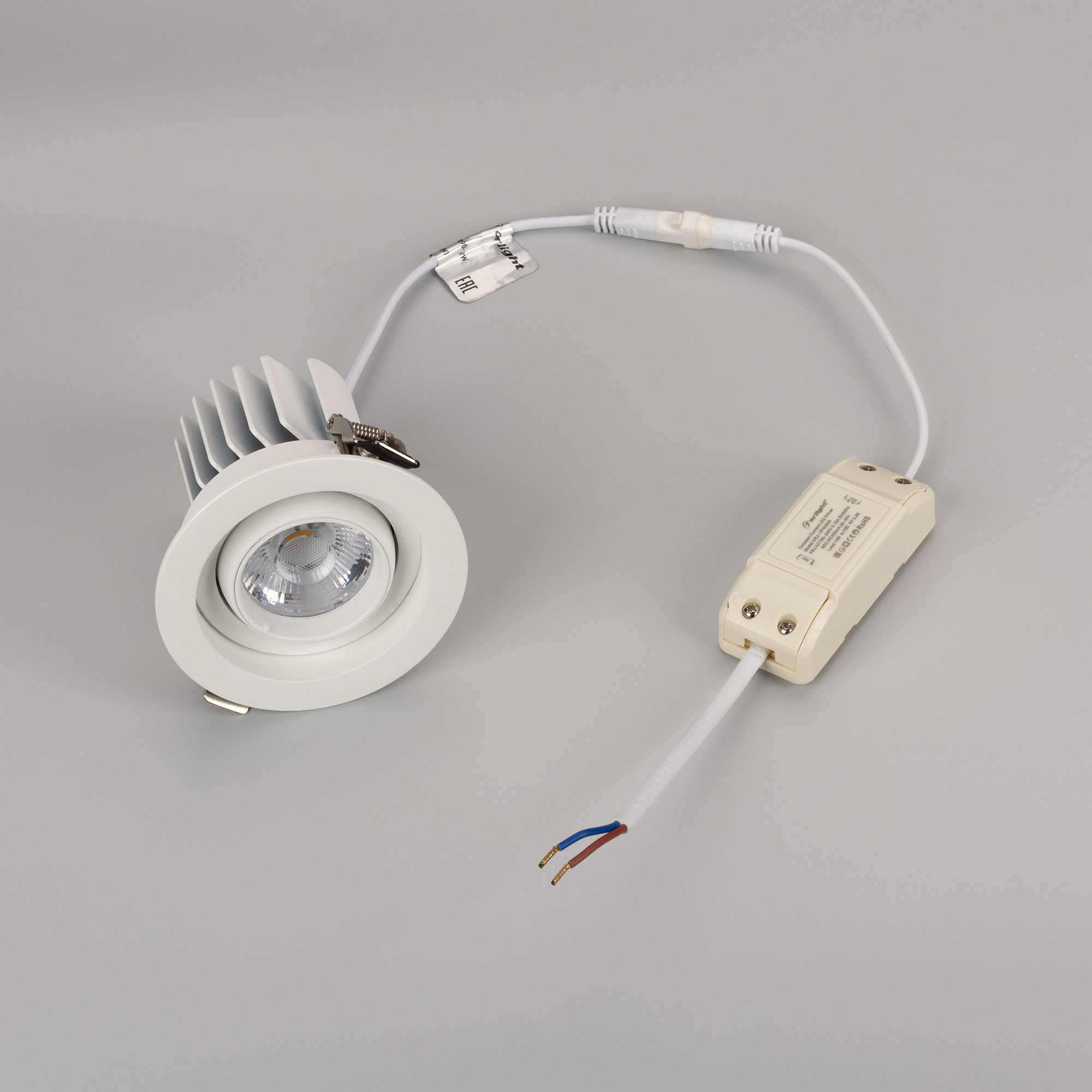 Встраиваемый карданный светильник. Мощность 12 Вт, св. поток 1318 лм, 109 лм/Вт, дневной 4000 K, CRI>92, угол 20°, напряжение питания 230 В. Белый корпус из алюминия, белая вставка, степень защиты IP20. Размер: диаметр 90 мм, высота 80 мм. Монтаж встраиваемый, установочное отверстие: диаметр 75 мм. Драйвер 27-40 В, 300 мА, пульсация <2%.