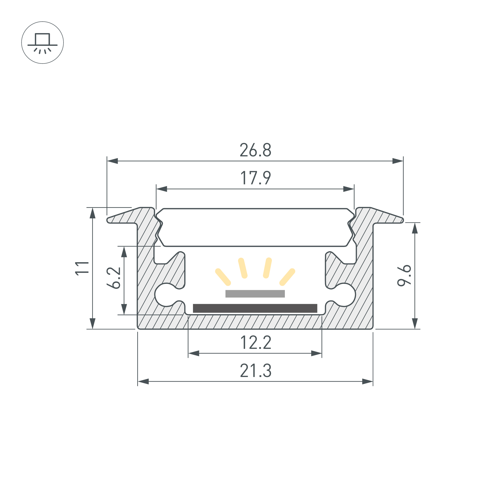 Алюминиевый анодированный профиль с фланцем. Возможность герметизации до IP65 (при использовании силиконового клея для фиксации экрана и заглушек), IK10 (08-10). Габаритные размеры (L×W×H): 2000x26,8x11 мм. Ширина площадки для ленты 12,2 мм. Заглушки и другие аксессуары приобретаются отдельно. Цена за 1 метр.