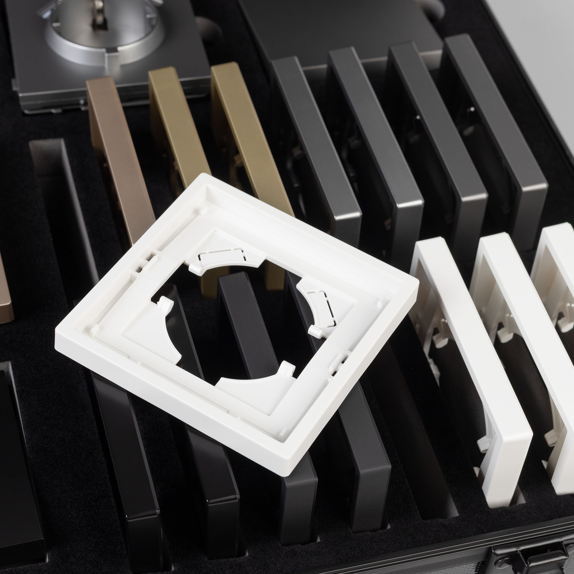 Рамки серии TENDO в цветах белый, черный, золотой и серебристый (серый). Поверхность рамок имеет матовое и Soft-Touch покрытие;