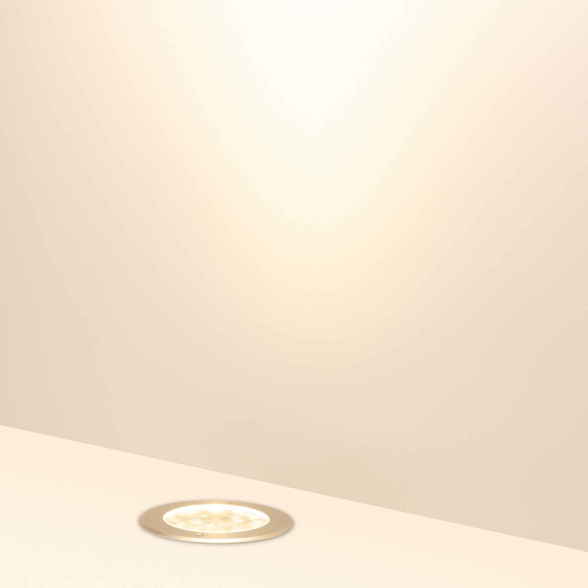 Встраиваемый светодиодный светильник для грунта и пола. Мощность 36Вт, световой поток 2824 лм, цвет теплый 3000К. CRI(Ra)>80, угол 10°. Круглый влагозащищенный корпус IP67, нержавеющая сталь. Экран закалённое стекло. Питание 230В, 36Вт. Размер DxH Ø210x125мм. Установка в отверстие DxH Ø195x119мм.