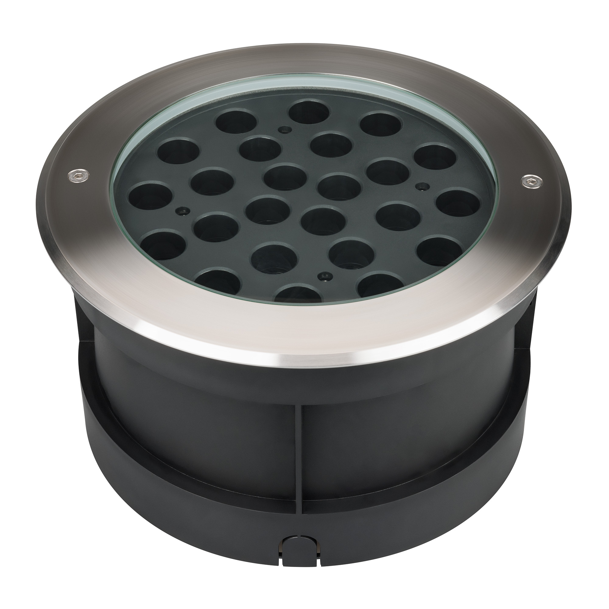 Встраиваемый светодиодный светильник для грунта и пола. Мощность 48Вт, световой поток 3250 лм, цвет дневной 4000К. CRI(Ra)>80, угол 10°. Круглый влагозащищенный корпус IP67, нержавеющая сталь. Экран закалённое стекло. Питание 230В, 48Вт. Размер DxH Ø260x150мм. Установка в отверстие DxH Ø239x144мм.