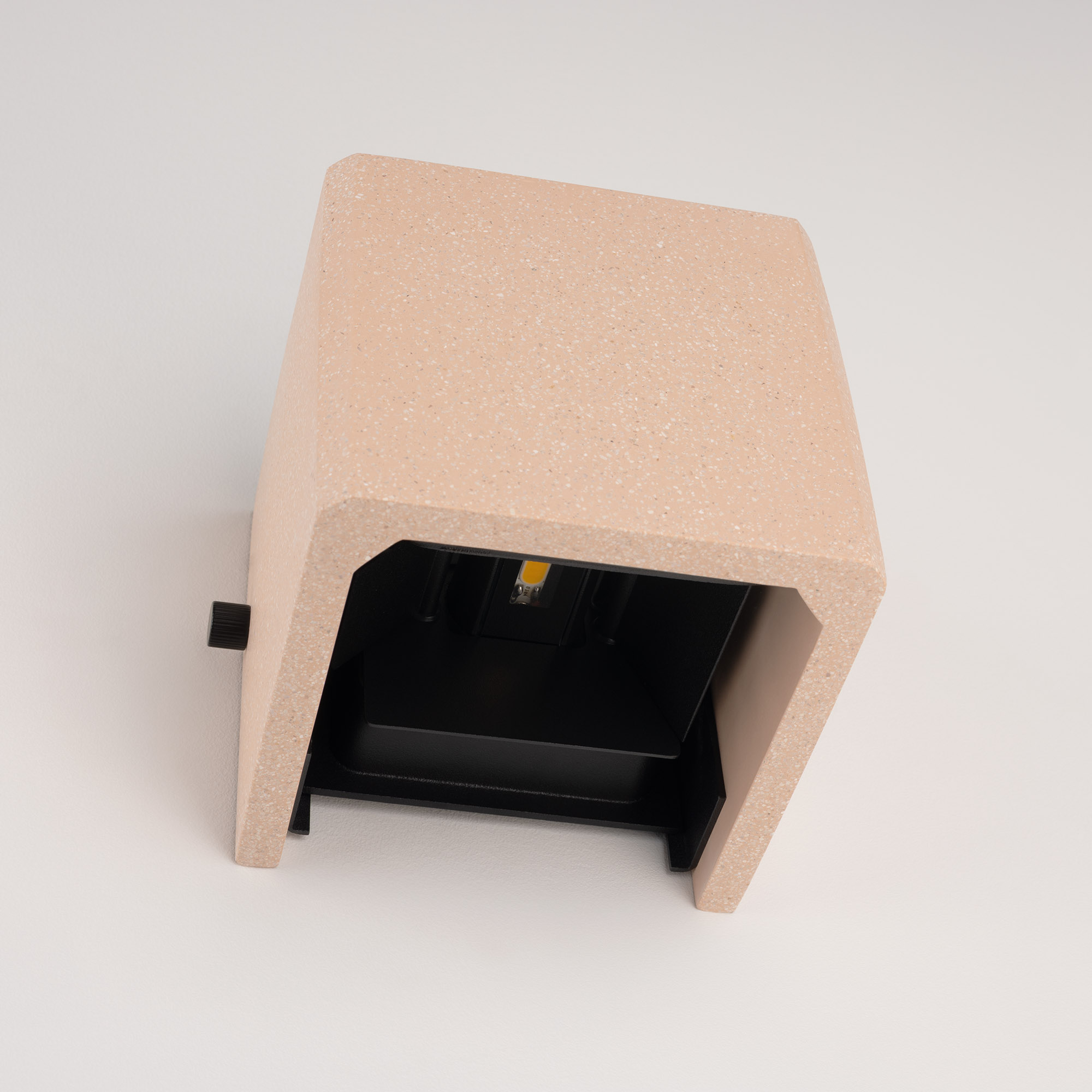 Накладной настенный светильник, свечение вверх/вниз. Мощность 6 Вт, св. поток 286 лм, 49 лм/Вт, теплый 3000 K, CRI>90, изменяемый угол освещения 0°-80°, напряжение питания 230 В. Фигурный корпус из бетона цвета светлой слоновой кости и алюминия, экран ударопрочный PC, степень защиты IP65. Размер: длина 120 мм, ширина 120 мм, высота 120 мм. Монтаж накладной. Драйвер встроенный, пульсация <0.5%.