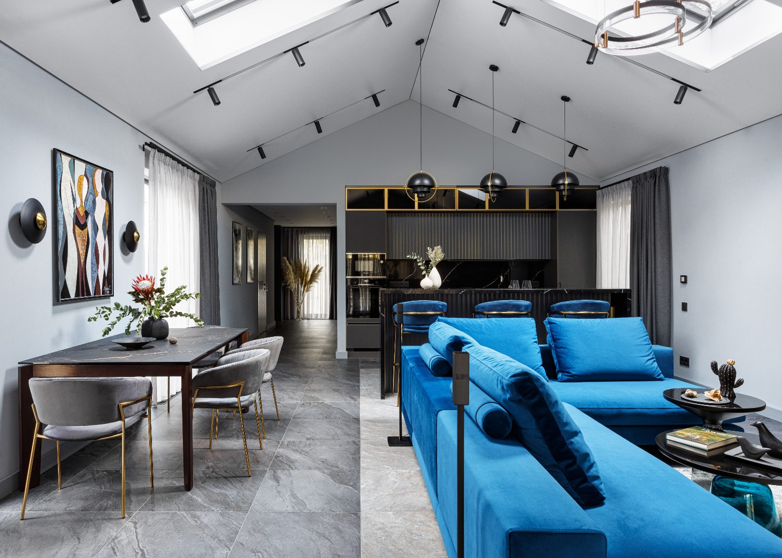 В интерьере частного дома в стиле барнхаус преобладает благородная серая цветовая гамма — от легких дымчатых оттенков до антрацита. При этом пространство не монотонно: в каждой комнате взгляд встречает контрастные элементы в освежающих золотистом, голубом и зеленом цветах.