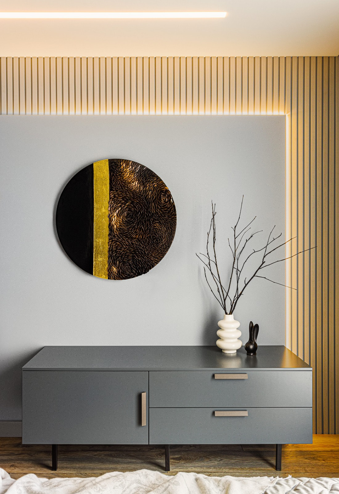 Повторяющийся элемент во всем доме — панель из небольших реек. Мини-профиль серии PIK позволил создать подсветку панелей без видимости источника света, что подчеркнуло рельефную фактуру.