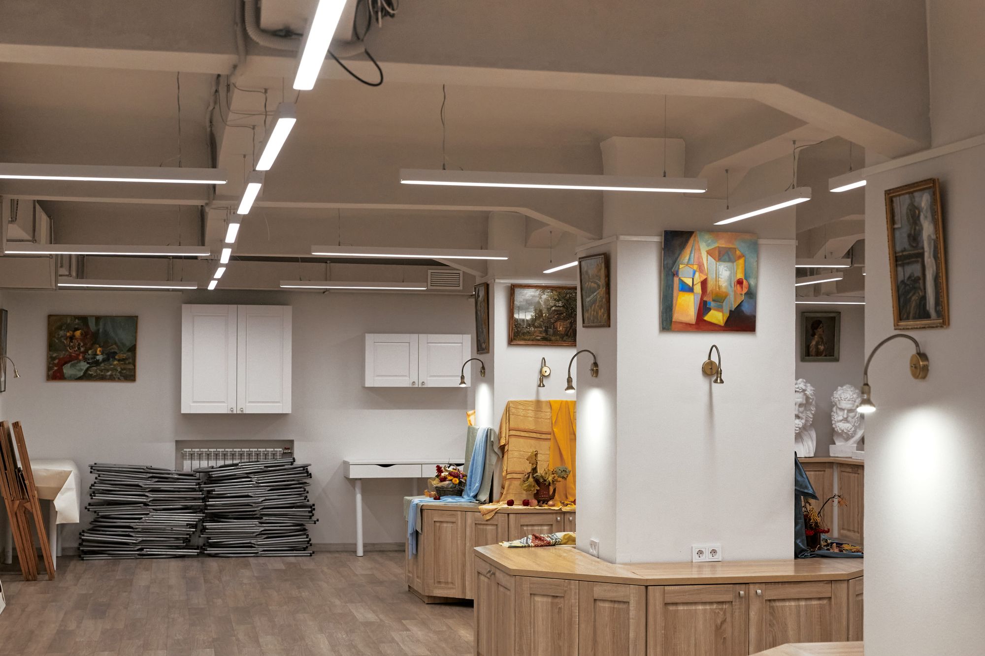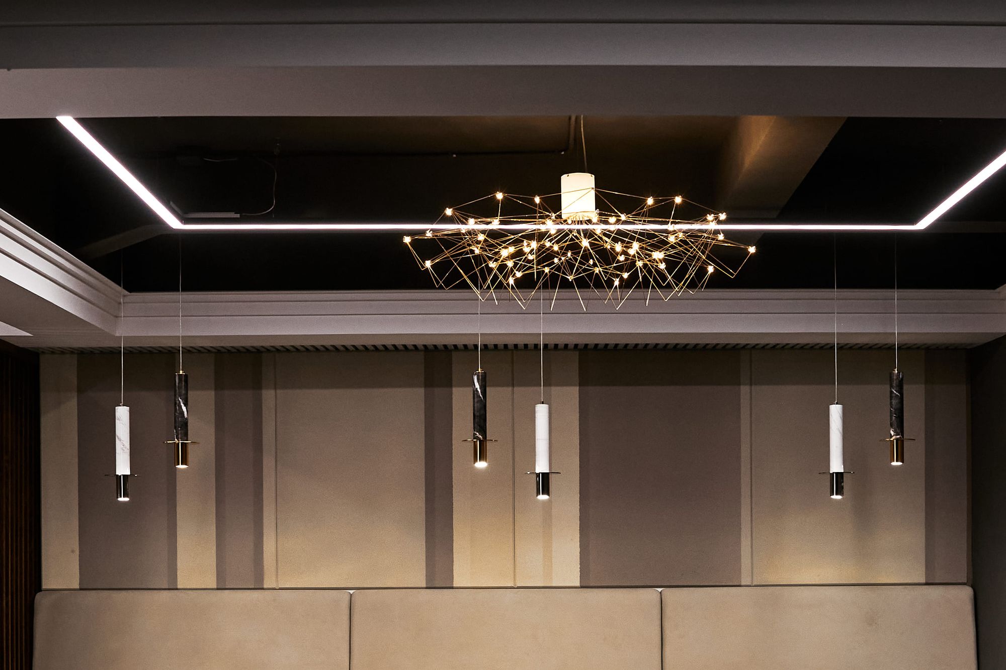 В отличие от танцевальной студии, подвесные линии света выполнены в более легком белом цвете. Расположенные в форме решетки, они словно являются продолжением потолочных перекрытий.
