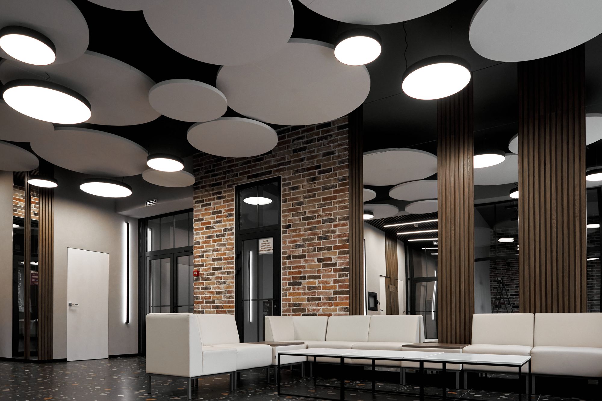 Круглые светильники RONDO отлично вписываются в интерьер холла детского центра, создавая легкую и непринужденную атмосферу. Благодаря матовому экрану образуется мягкое рассеянное свечение, которое не нанесет вреда детскому зрению.
