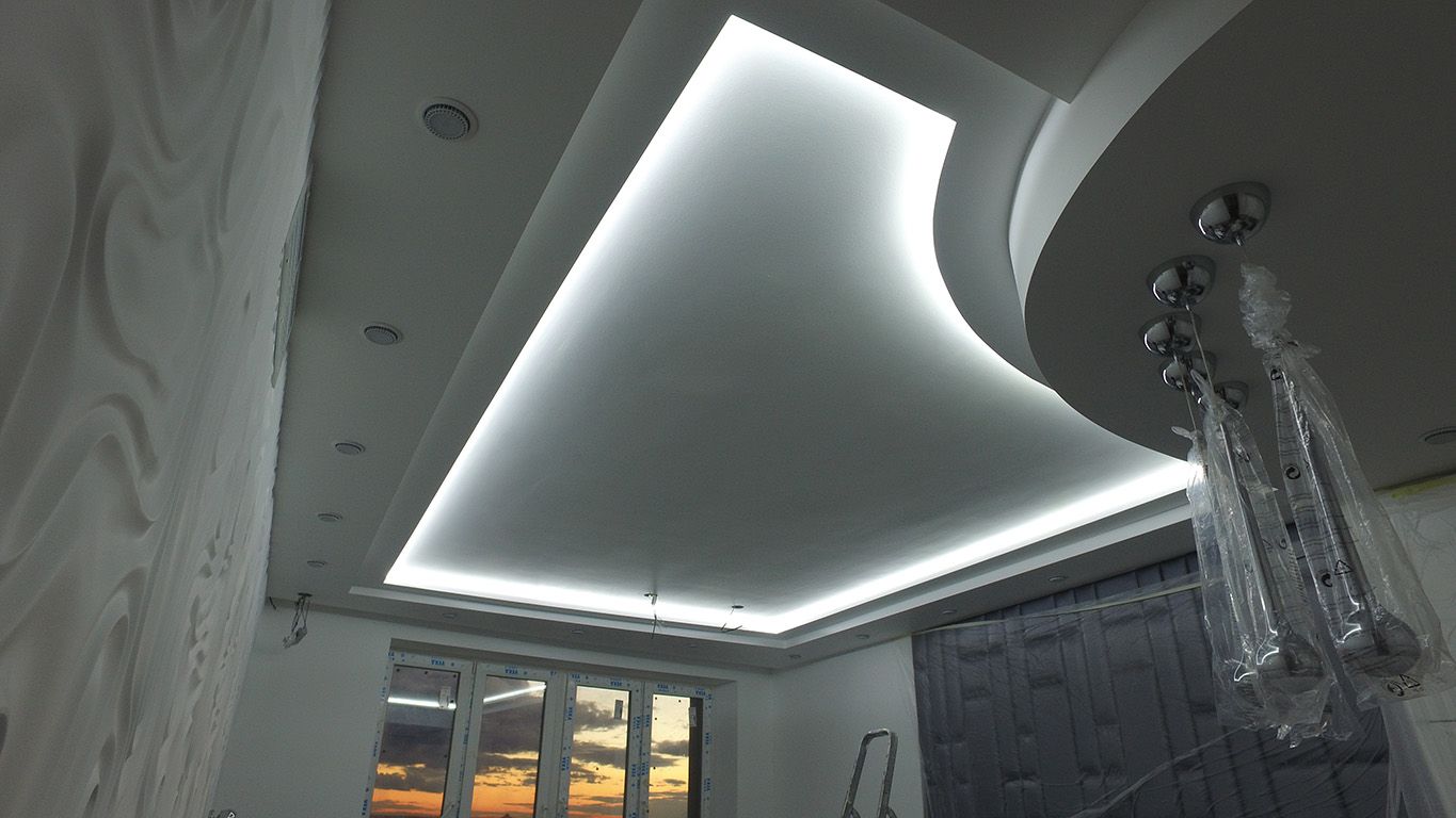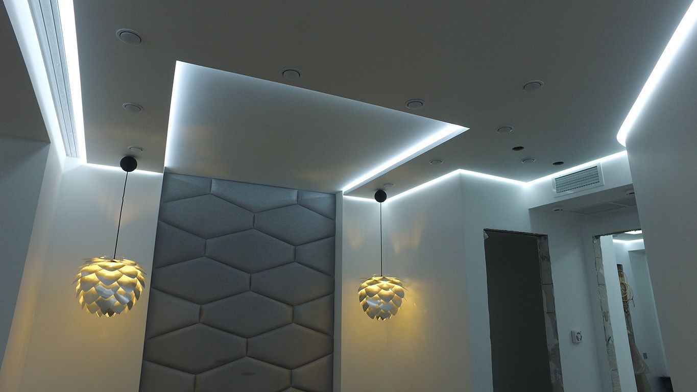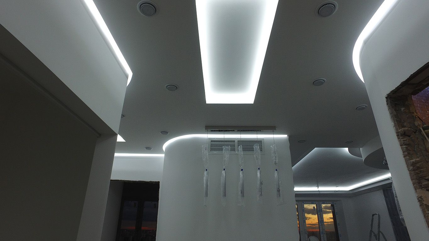 Задачей данного проекта являлось создание фонового освещения по всей квартире. Для этого во многочисленные объемные ниши потолка была установлена светодиодная подсветка.