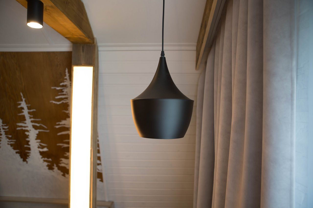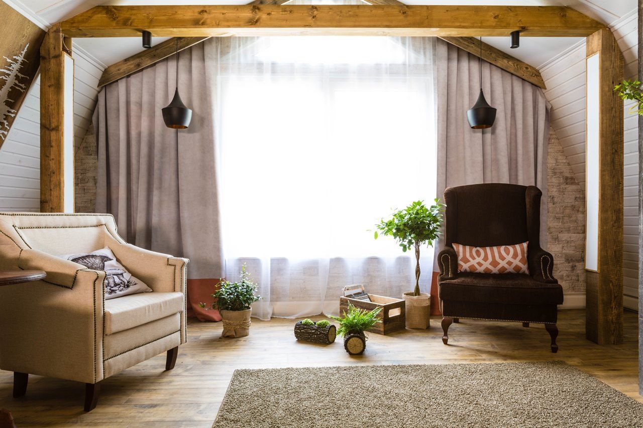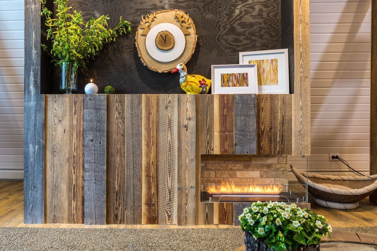 Новые идеи в телепроекте "Фазенда" на мансарде в 42 квадратных метра появилась лесная гостиная. На стене – лес еловый. Есть даже пенек. Перегородка - с осиновой рощей… Дерево, камень, камин. Почти классическое шале. Освещение в гостиной реализовано различными светодиодными светильниками.