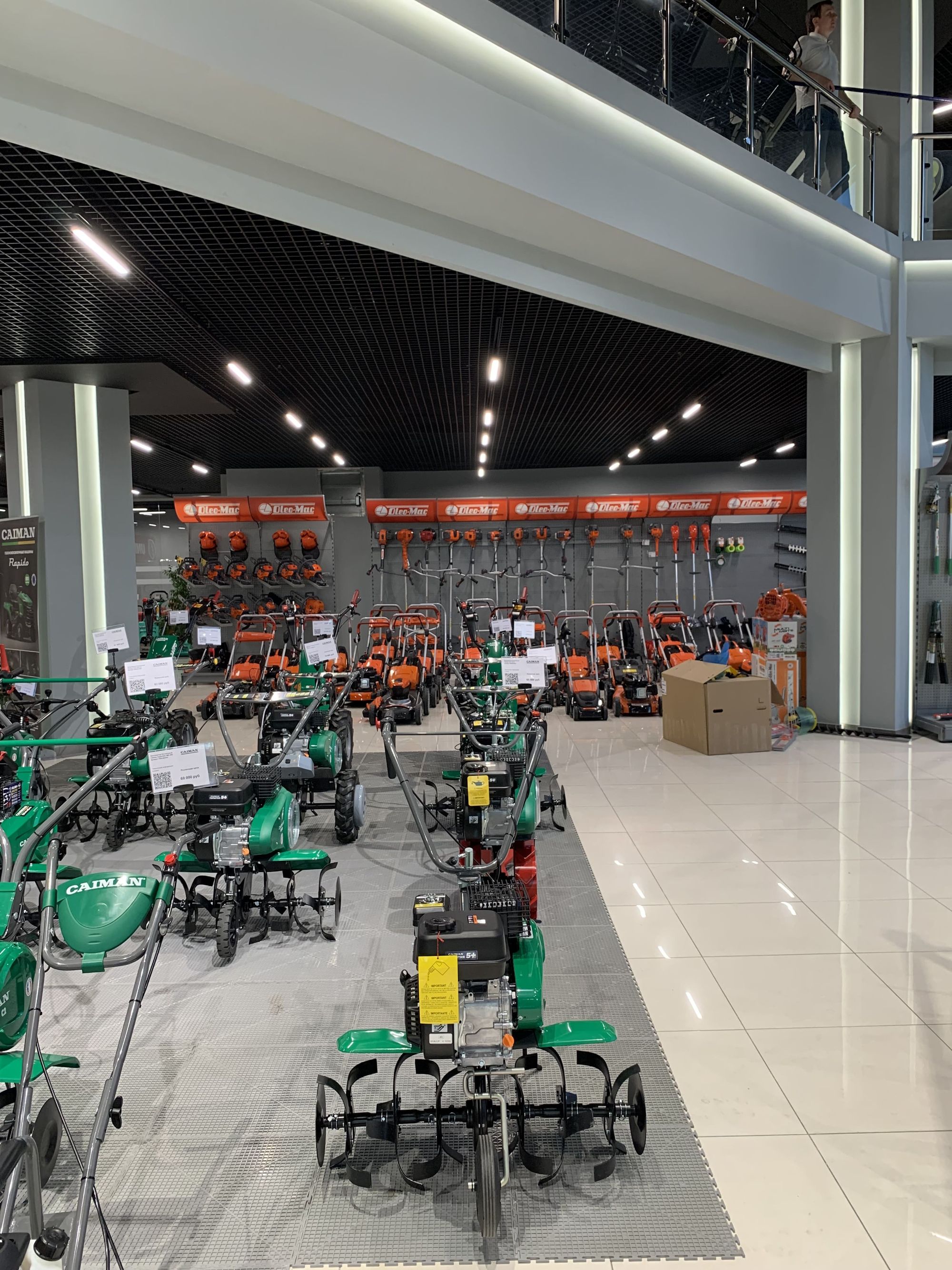 Сегодня на месте «Армстронга» — черный матовый потолок «Грильято». На его фоне линии трековых систем смотрятся стильно, подчеркивая техническую направленность шоурума. В выставочном зале с высокими потолками применяется комбинированное освещение: трековые светильники цилиндрической формы для расстановки световых акцентов и компактные встраиваемые даунлайты на потолке для основного освещения. Такое сочетание позволило создать в шоуруме гармоничный и комфортный свет для осмотра садового оборудования.