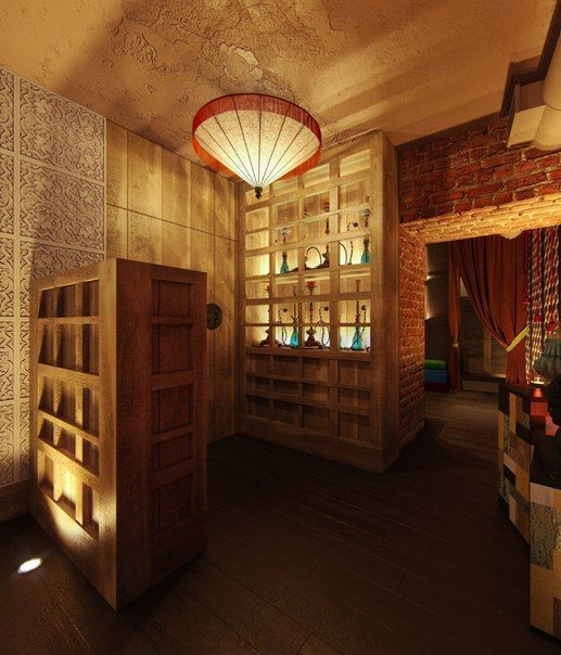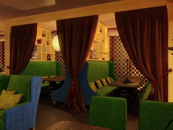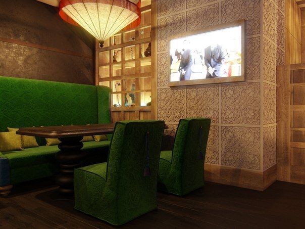В данном ресторане была установлена декоративная и акцентная подсветка полок и других деталей интерьера.
